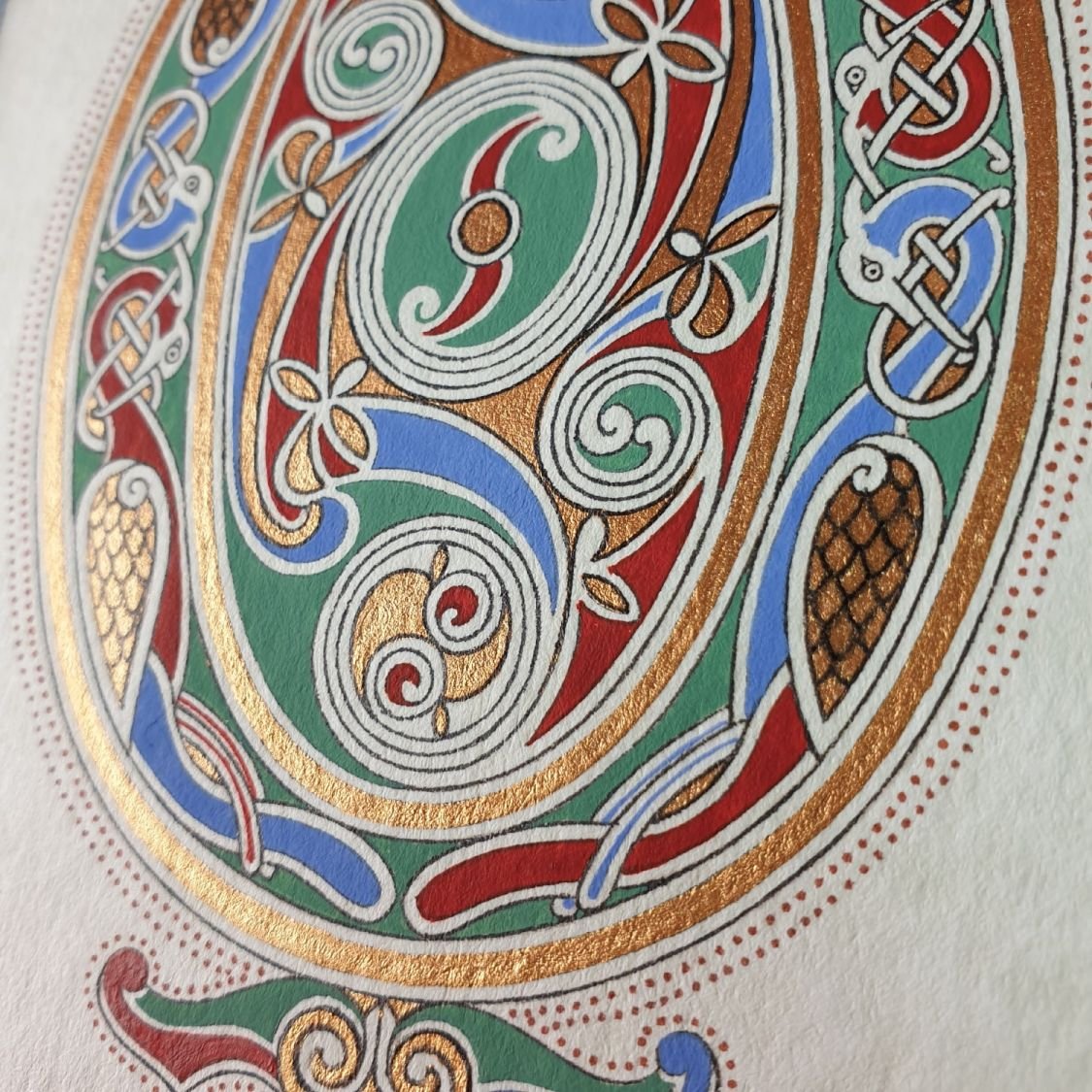 Cette initiale est inspirée d'une lettrine de style insulaire (dit aussi celtique ou anglo-saxon) de la fin du VIIe siècle.